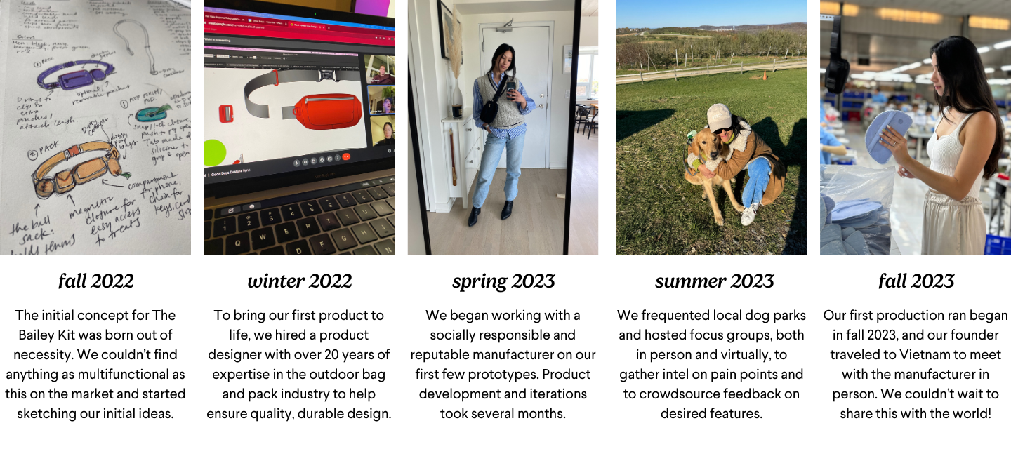 We’re a team of problem solvers. Our founder Ivana was frustrated by the friction involved in constantly switching out her essentials and Bailey’s essentials across different bags every time she went out with Bailey, which was at least 3 times a day, every day. It started as a small problem that compounded with time. Conversations with other pet parents made her realize that she was not alone.